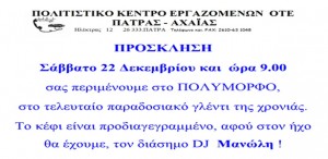 Το Σάββατο 22 Δεκεμβρίου σας περιμένουμε στο Πολύμορφο, στο τελευταίο παραδοσιακό γλέντι της χρονιάς. Το κέφι θα είναι προδιαγεγραμμένο, αφού στον ήχο θα έχουμε τον διάσημο DJ Μανώλη!!!
