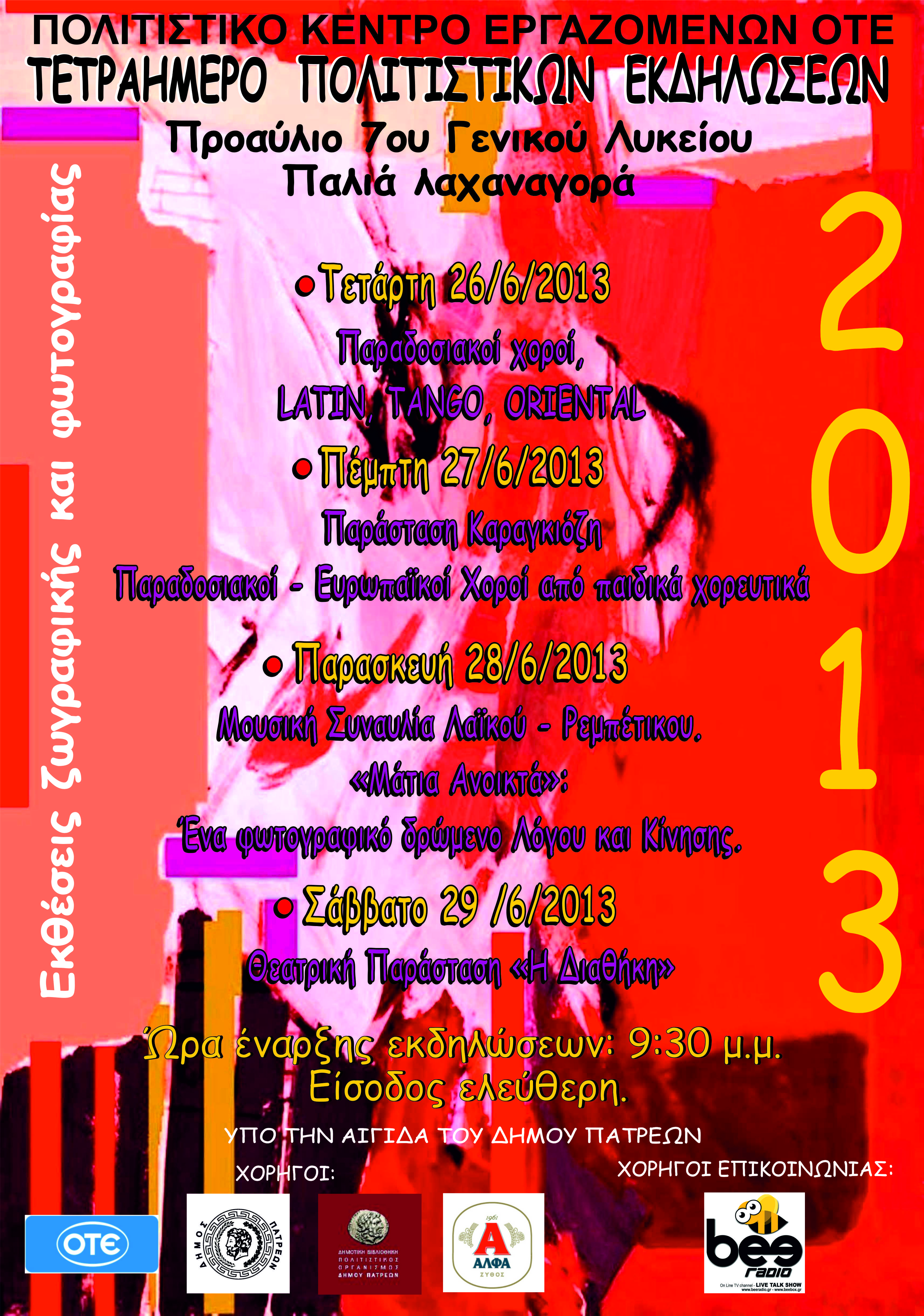 Το Πολιτιστικό Κέντρο Εργαζομένων ΟΤΕ Πάτρας – Αχαΐας, διοργανώνει τετραήμερο πολιτιστικών εκδηλώσεων, από Τετάρτη 26/6 έως Σάββατο 29/6/1 2013, στo προαύλιο του 7ου Λυκείου (τέρμα Κορίνθου – παλιά λαχαναγορά). Στη διάρκεια του τριήμερου, θα παρουσιαστεί η δουλειά όλων των ομάδων του Πολιτιστικού Κέντρου. Το πρόγραμμα των εκδηλώσεων περιλαμβάνει: