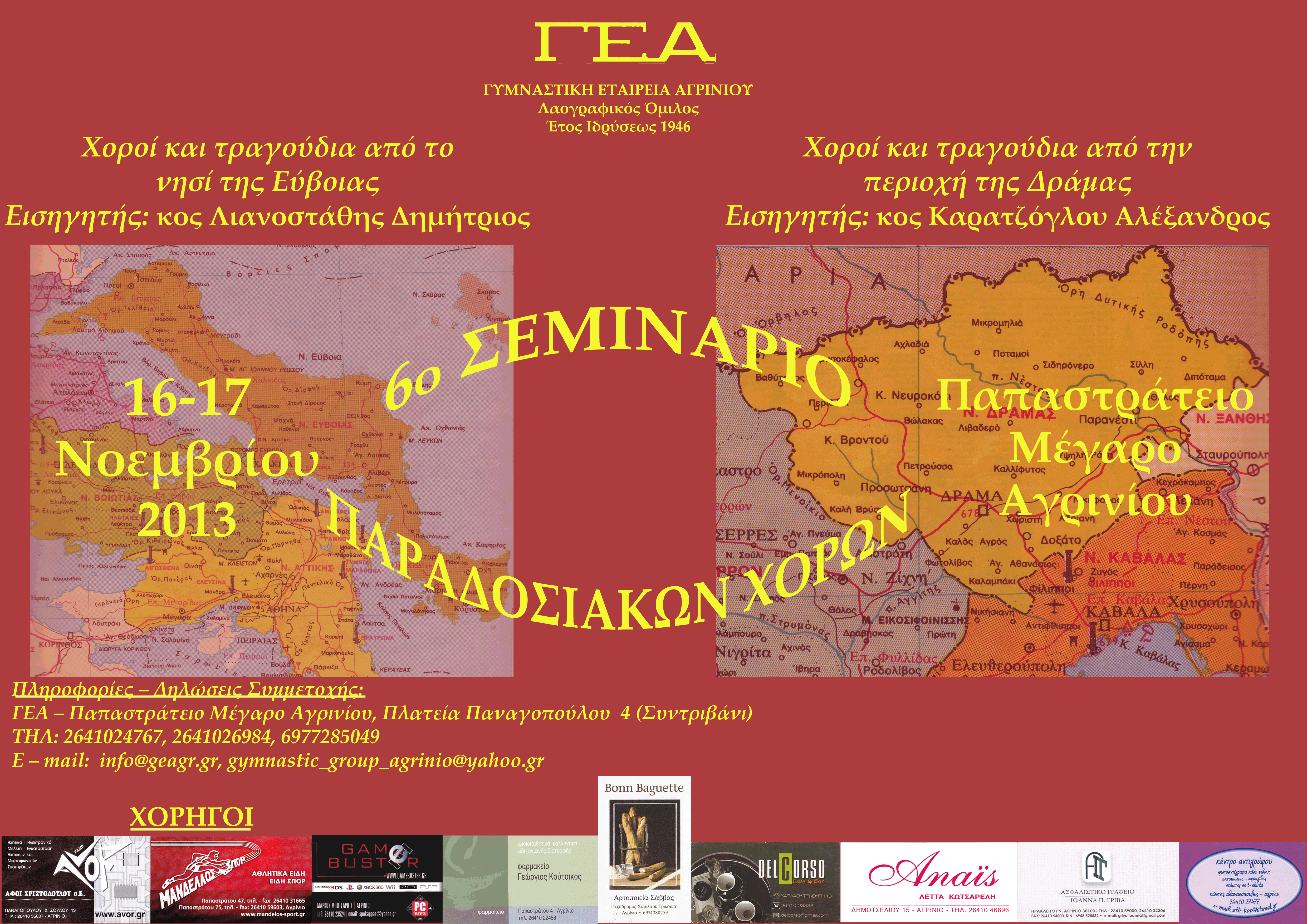 Στις 16 και 17 Νοεμβρίου 2013, ο Λαογραφικός Όμιλος της Γυμναστικής Εταιρείας Αγρινίου διοργανώνει το 6ο Σεμινάριο Παραδοσιακών Χορών στο Αγρίνιο.