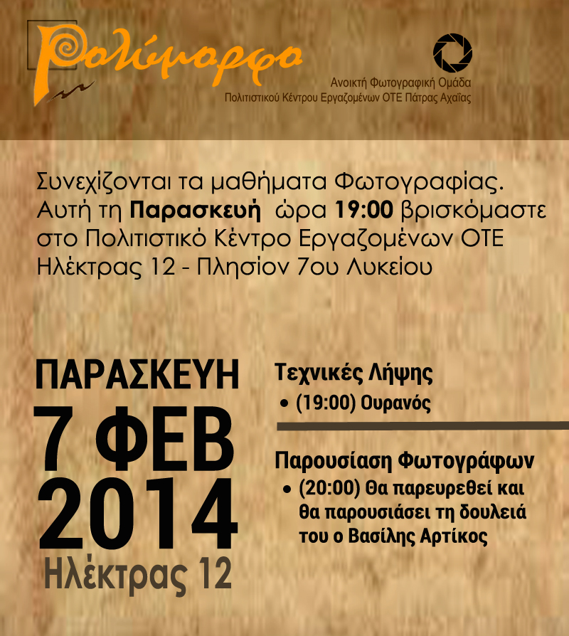Ο Βασίλης Αρτίκος, καλεσμένος της Ανοικτής  Φωτογραφικής Ομάδας Πολύμορφο, του Πολιτιστικού Κέντρου Εργαζομένων στον ΟΤΕ- Πάτρας- Αχαΐας, θα παρουσιάσει την Παρασκευή, 7/2/2014 στις 8μμ ένα αντιπροσωπευτικό κομμάτι του φωτογραφικού του έργου.