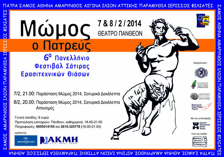 6ο Πανελλήνιο Φεστιβάλ Σάτιρας Ερασιτεχνικών Θιάσων «Μώμος ο Πατρεύς» (Πάτρα 6-7-8-9 Φεβρουαρίου 2014).