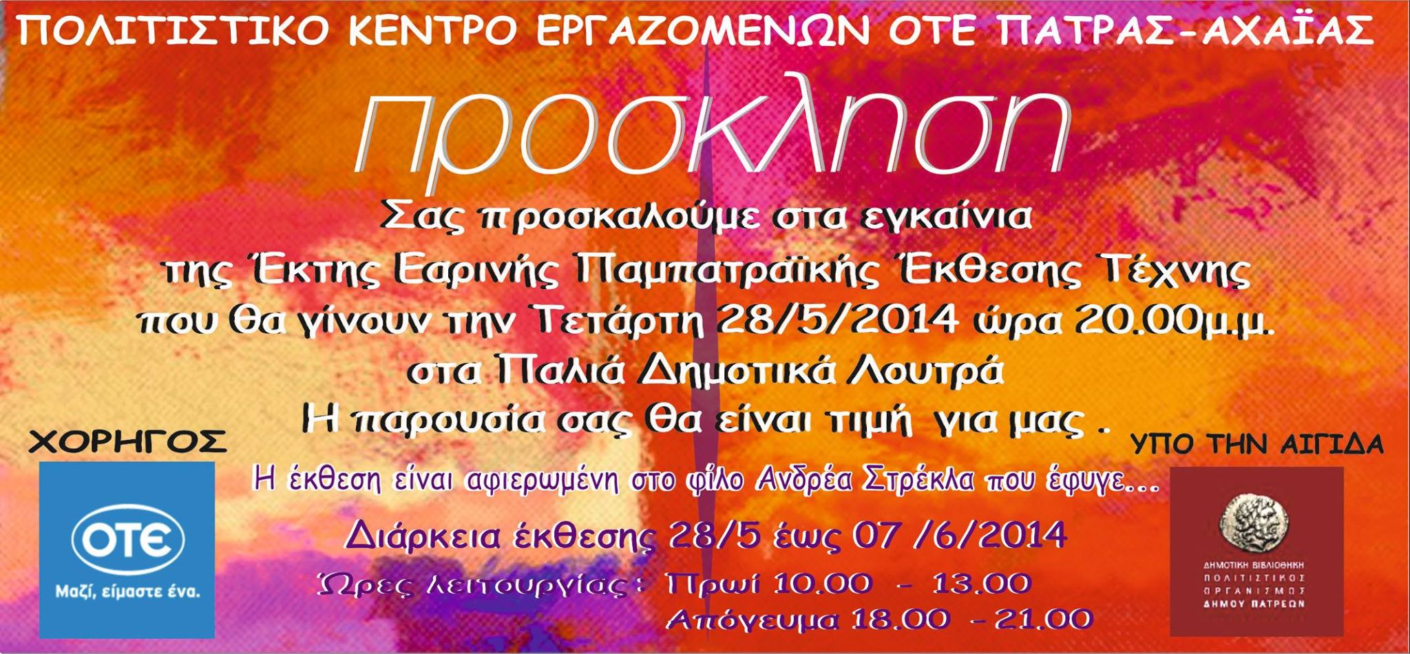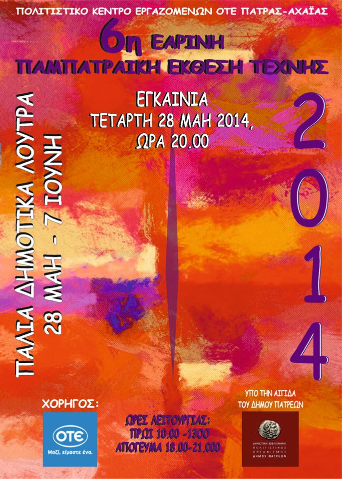 Το Πολιτιστικό Κέντρο Εργαζομένων ΟΤΕ Πάτρας- Αχαΐας ύστερα από την επιτυχία της 5ης Εαρινής Παμπατραϊκής Έκθεσης Τέχνης τον Μάιο του 2013 που ήταν διοργανωτής, επαναλαμβάνει φέτος τη διοργάνωση που έγινε θεσμός για την Πόλη μας.