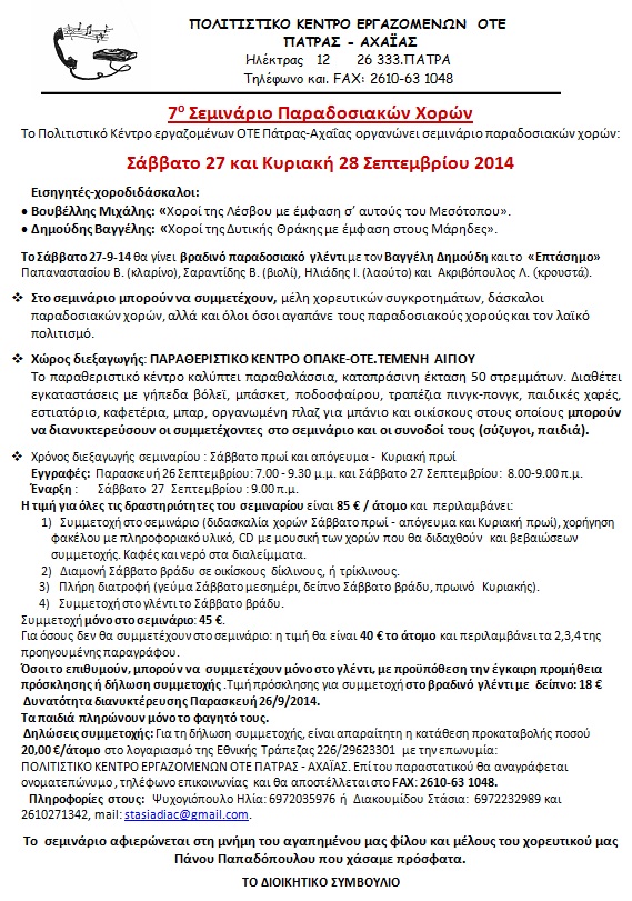 Το Πολιτιστικό Κέντρο εργαζομένων ΟΤΕ Πάτρας-Αχαΐας οργανώνει σεμινάριο παραδοσιακών χορών: