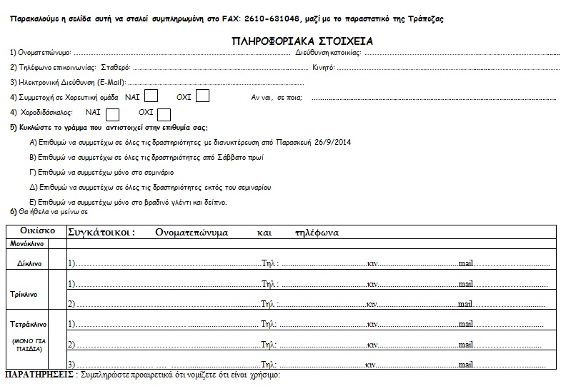 Δηλώσεις συμμετοχής: Για τη δήλωση συμμετοχής, είναι απαραίτητη η κατάθεση προκαταβολής ποσού 20,00 €/άτομο στο λογαριασμό της Εθνικής Τράπεζας 226/29623301 με την επωνυμία: