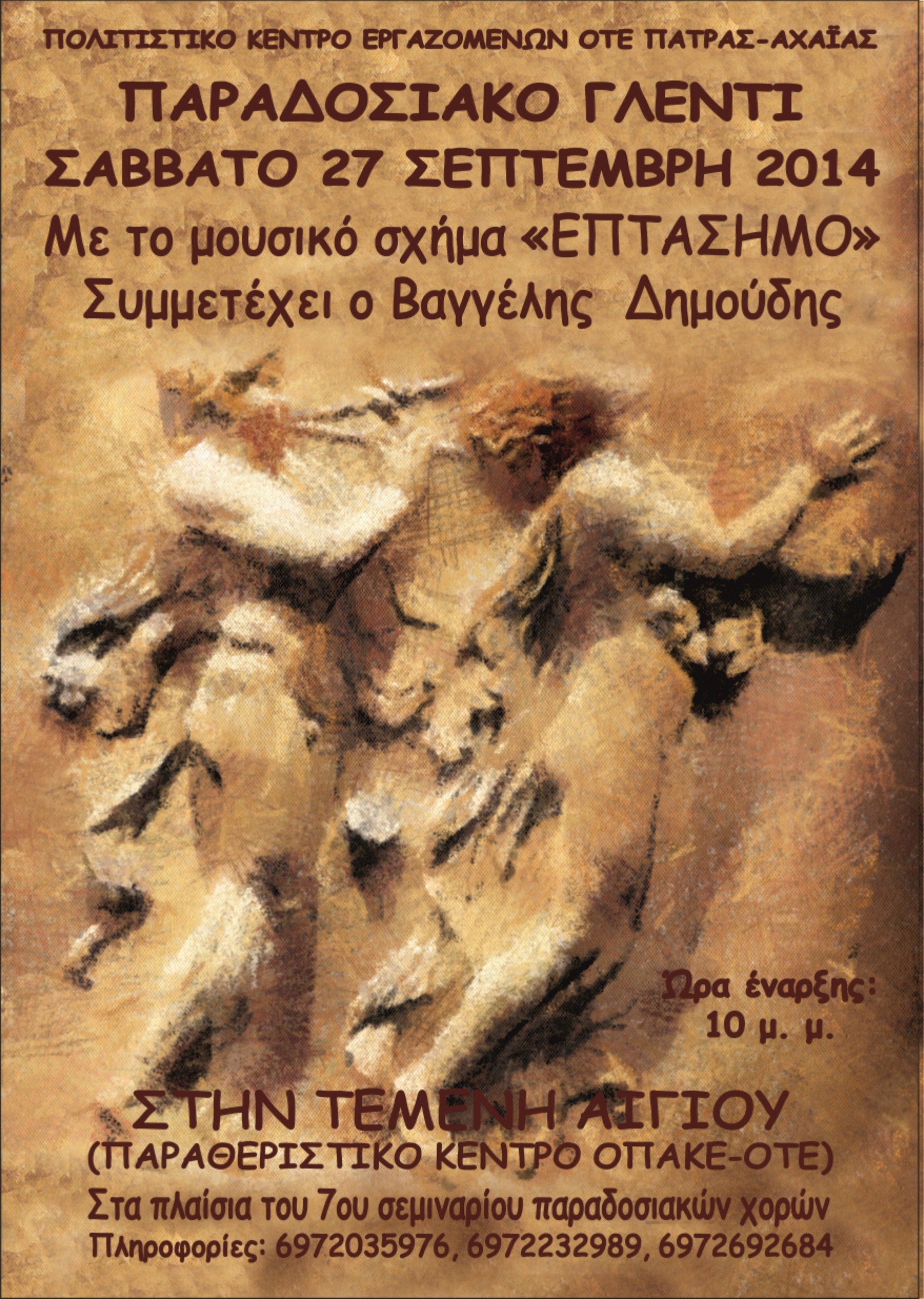 Το Σάββατο 27-9-14 θα γίνει βραδινό παραδοσιακό γλέντι με τον Βαγγέλη Δημούδη και το «Επτάσημο» Παπαναστασίου Β. (κλαρίνο), Σαραντίδης Β. (βιολί), Ηλιάδης Ι. (λαούτο) και Ακριβόπουλος Λ. (κρουστά).