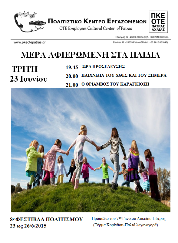 ΤΡΙΤΗ 23/6/2015: Μέρα αφιερωμένη στα παιδιά. Τα παιδιά θα παίξουν «παιχνίδια του χθες και του σήμερα».