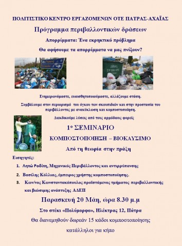 Το Πολιτιστικό Κέντρο Εργαζομένων ΟΤΕ Πάτρας-Αχαΐας, διοργανώνει σεμινάριο με θέμα κομποστοποίηση – βιοκαύσιμο, την Παρασκευή 20 Μάη 2016, ώρα 8.30 μ.μ., στο στέκι «Πολύμορφο» Ηλέκτρας 12 Πάτρα.
