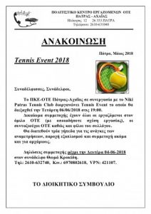 Το ΠΚΕ-ΟΤΕ Πάτρας-Αχαΐας σε συνεργασία με το Niki Patras Tennis Club διοργανώνει Tennis Event το οποίο θα διεξαχθεί την Τετάρτη 06/06/2018 στις 19:00.
