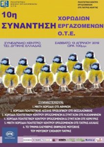 Η Πολιτιστική Ένωση Εργαζομένων ΟΤΕ και το Πολιτιστικό Κέντρο Εργαζομένων ΟΤΕ Πάτρας-Αχαΐας, συνδιοργανώνουν την 10η Συνάντηση Χορωδιών ΟΤΕ, το Σάββατο 13 Απριλίου 2019, στο «Συνεδριακό Κέντρο του ΤΕΙ Δυτικής Ελλάδας» στην Πάτρα.