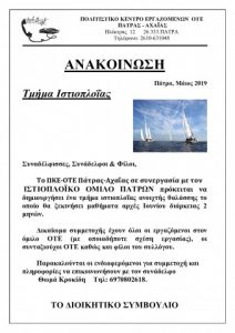 Το ΠΚΕ-ΟΤΕ Πάτρας-Αχαΐας σε συνεργασία με τον ΙΣΤΙΟΠΛΟΪΚΟ ΟΜΙΛΟ ΠΑΤΡΩΝ πρόκειται να δημιουργήσει ένα τμήμα ιστιοπλοΐας ανοιχτής θαλάσσης το οποίο θα ξεκινήσει μαθήματα αρχές Ιουνίου διάρκειας 2 μηνών.