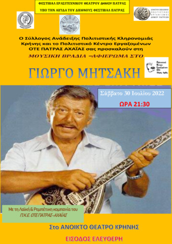 Η κομπανία του Πολιτιστικού Κέντρου Εργαζομένων ΟΤΕ Πάτρας-Αχαΐας, παρουσιάζει το «Αφιέρωμα στον Γιώργο Μητσάκη»,