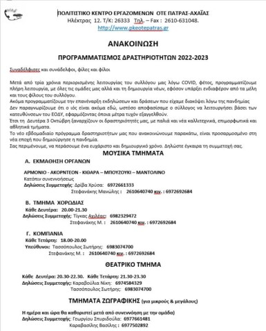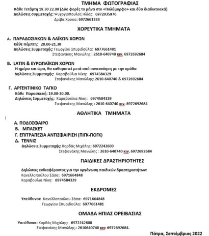 Έτσι τη Δευτέρα 3 Οκτώβρη ξαναρχίζουν οι δραστηριότητές μας, με παλιά και νέα καλλιτεχνικά, επιμορφωτικά και αθλητικά τμήματα.