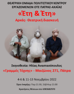Η θεατρική ομάδα του Πολιτιστικού Κέντρου Εργαζομένων ΟΤΕ Πάτρας-Αχαΐας, ανεβάζει στο θέατρο «Γραμμές Τέχνης» στην Πάτρα το έργο «ΕΤΗ ΚΑΙ ΕΤΗ», σε σκηνοθεσία Ηλία Αναστασόπουλου.