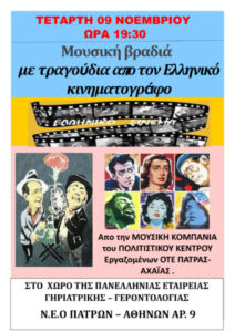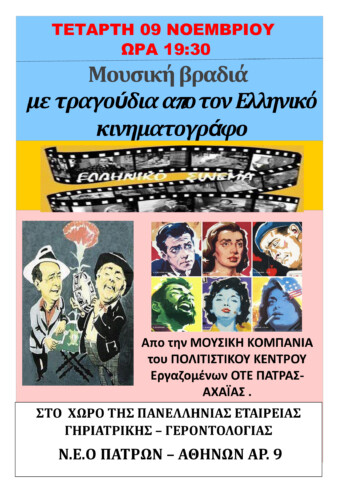 Μια βραδιά αφιερωμένη στη μουσική και τα τραγούδια που ακούστηκαν σε ταινίες του παλιού ελληνικού κινηματογράφου. Η κομπανία του Πολιτιστικού Κέντρου θα τραγουδήσει τραγούδια των Χατζιδάκι, Θεοδωράκη, Μαρκόπουλου, Πλέσσα, Ξαρχάκου, Σουγιούλ, Μητσάκη και άλλων τραγουδοποιών.
